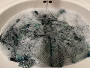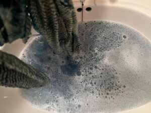 なぜ?色落ちの様子・生地の縮み具合を確認して作業をするための工程になります。